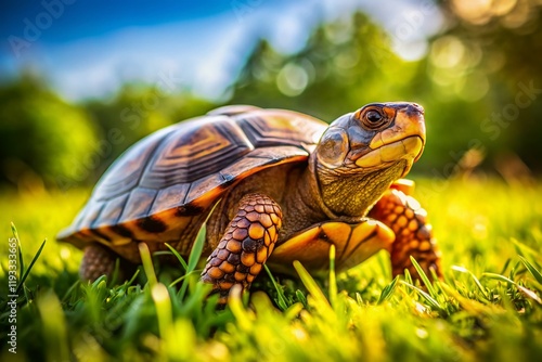 © Danicha, Obraz premium Candid Photo: Turtle in a Sunny Park - Peaceful Reptile Enjoying Nature