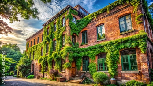 © Sirinporn, Fototapeta premium Candid Photography of an Old Brick Building with Weathered Facade and Lush Greenery in a Historic Urban Setting Capturing the Charm of Architectural Heritage and Timeworn Beauty