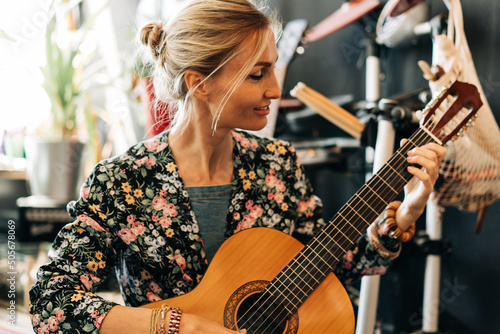 Fototapeta premium Candid portrait of a smiling woman playing the guitar.
