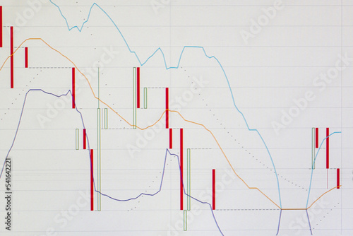 © Alekskan12, Naklejka premium Candle price chart with indicators on a white background close-up. Online trading of stocks and cryptocurrencies on the stock exchange