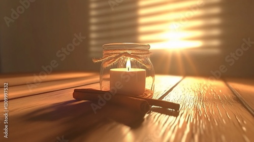 © akhmad, Obraz premium Candlelight, Cinnamon, Wooden Table, Sunset Window