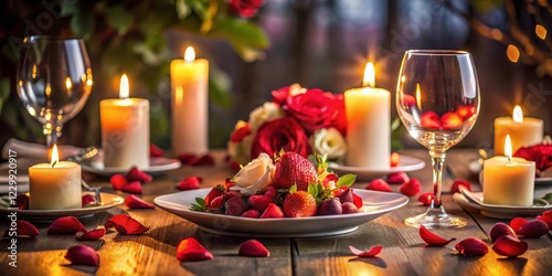 Fototapeta premium Candlelit Dinner Table with Rose Petals and Fresh Fruits, Dinner, Dinner...