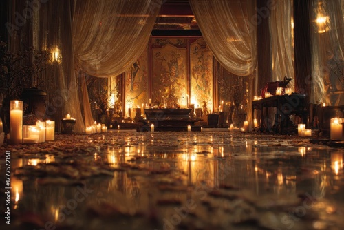 Fototapeta premium candlelit temple interior filled with warm amber light, silk fabrics flowing, petals scattered on the floor