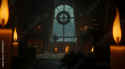 © KANAKA, Obraz premium Candlelit Winter Room with Fireplace and Christmas Wreath