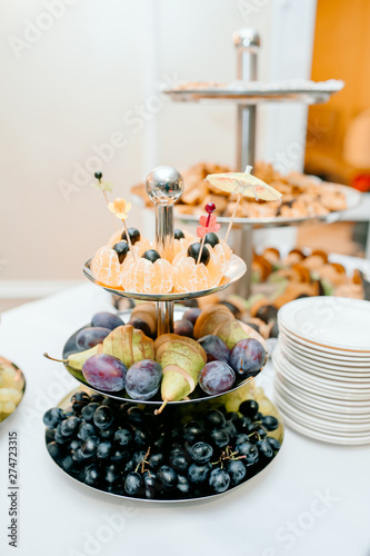 © Валентина Свиридо, Naklejka premium Candy bar. White wedding cake decorated by flowers standing of festive table with deserts, strawberry tartlet and cupcakes. Wedding. Reception Tartlets