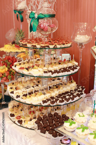 Fototapeta premium Candy bar. White wedding cake decorated by flowers standing of festive table with deserts, strawberry tartlet and cupcakes. Wedding. Reception Tartlets