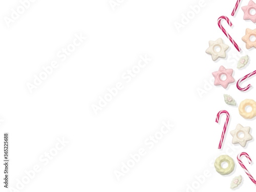 Fototapeta premium Candy canes and meringue on the right side of the frame on a white isolated...