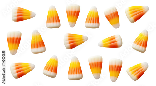 Obraz premium Candy corn pieces scattered on a white background