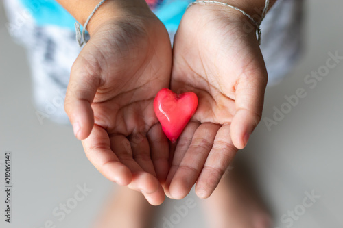 © Nueng, Fototapeta premium Candy red heart in hand a boy.