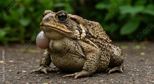Fototapeta premium Cane toad resting on ground, large invasive amphibian species known for toxic skin and ecological impact, perfect for wildlife and nature themes.