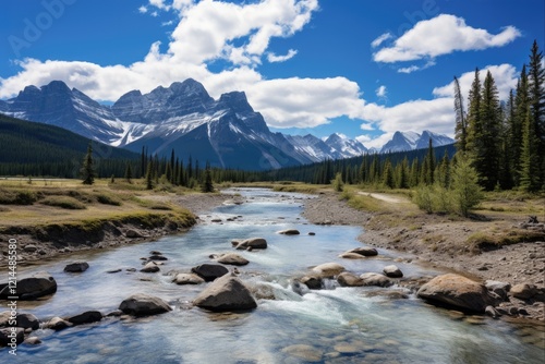 Fototapeta premium Canmore's Majestic Mountain Scenery: A Breathtaking Landscape of Lakes, Rivers & Snowy Peaks