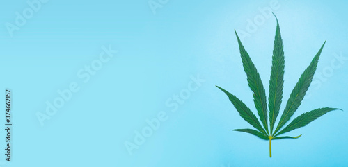 Fototapeta premium Cannabis (marijuana) leaves on a minimal blue banner background. Medical marijuana (hemp) and products from it.
