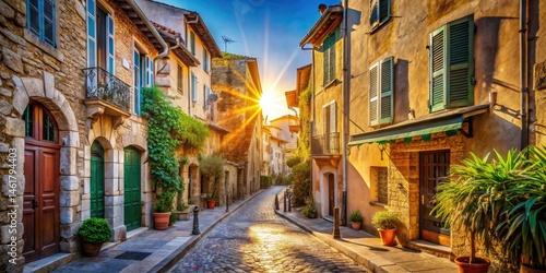 © nick, Fototapeta premium Cannes Old Town Street Photography, French Riviera Vintage Architecture, Charming Alleyway, Historic Buildings, Coastal Townscape