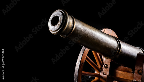 © NizuCaCi, Obraz premium cannon, metal, wooden, front, hole, shoot, old, ancient, wheel, weapon, black background, closeup