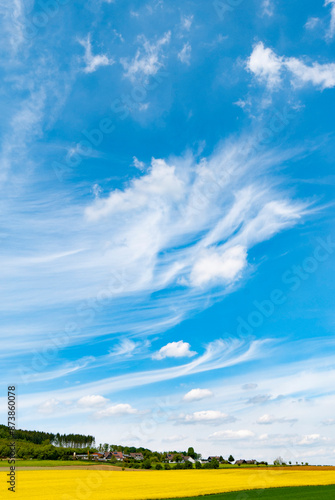Obraz premium Canola fields under bright cloudy sky summer time in North Rhine Westphalia...