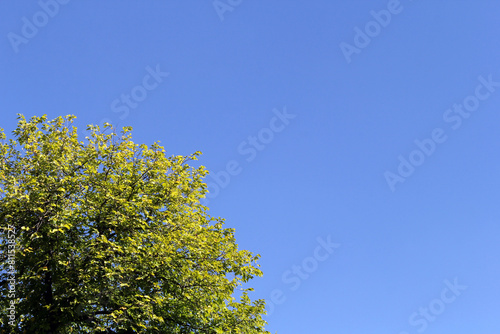 Obraz premium Canopy of a lush green tree against a clear blue sky abstract background