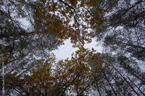 © Maryna, Obraz premium Canopy of treetops paints symmetrical, contrasting patterns against the sky.