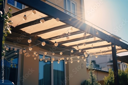 © sommersby, Obraz premium Canvas awning with metal frame and luminous garland of light bulbs against blue sunny sky. modern shading for house, created with Generative AI