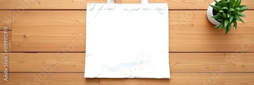 Fototapeta premium Canvas tote bag mockup on a wooden table with blank white space for customization, mockup, branding