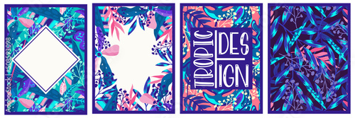 Fototapeta premium Canvas tropical set neon jungle. Summer botanical wallpaper. Botanical jungle. Abstract art background vector. Tropical foliage art background vector. Poster floral neon set