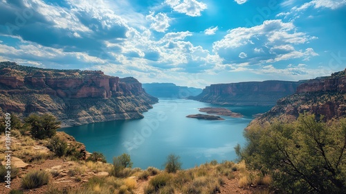 © Agang, Fototapeta premium Canyon lake scenic vista, sunny sky, desert plants