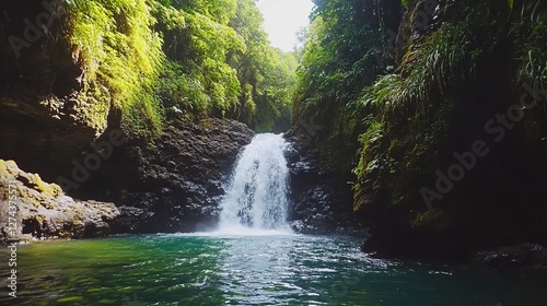 Naklejka premium * Canyoning enthusiasts rappelling through waterfalls.