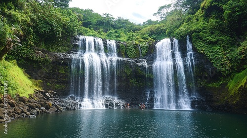 Fototapeta premium * Canyoning enthusiasts rappelling through waterfalls.