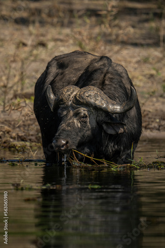 © Nick Dale, Obraz premium Cape buffalo stands in river chewing grass