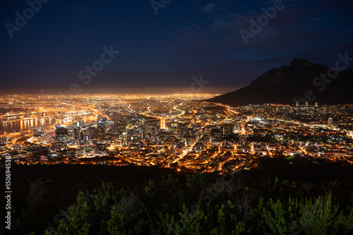 © ilyaska, Fototapeta premium Cape Town glowing at night seen from Signal Hill with Table Mountain in the background