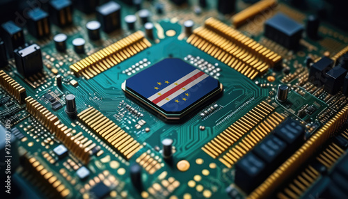 Obraz premium Cape Verde flag on a processor, CPU or microchip on a motherboard. Concept...