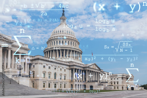 Naklejka premium Capitol dome building exterior, Washington DC, USA. Home of Congress, Capitol Hill. American political system. Technologies and education concept. Academic research, top ranking university, hologram