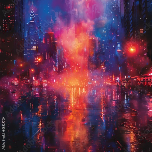 © Nurfadeelah, Fototapeta premium Captivate your audience with a unique poster Imagine a watercolor masterpiece, portraying a fantastical dystopian cityscape at a tilted angle, illuminated by vibrant neon hues