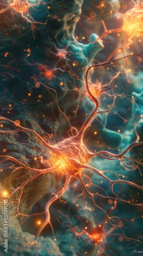 © Waraporn, Obraz premium Captivating abstract digital artwork depicting a powerful explosive burst of cosmic energy and luminous light swirling and flowing through a surreal psychedelic galactic landscape