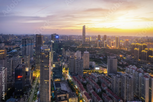 © zhouyilu, Fototapeta premium Captivating Aerial Cityscape at Sunset with Skyline and Urban Life