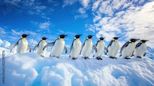 © Muhbahrir ghozali, Obraz premium Captivating Antarctic: A Line of Emperor Penguins on a Glacial Iceberg in the South Pole