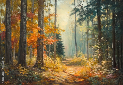 Fototapeta premium Captivating Autumn Forest Scene with Vibrant Leaves Illuminated by Soft...