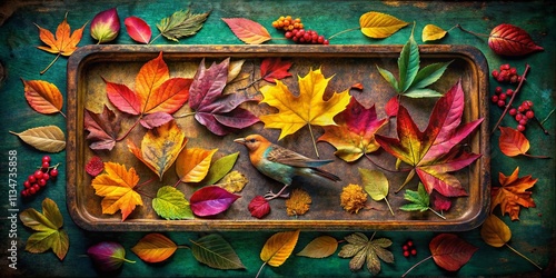 © Sirinporn, Fototapeta premium Captivating Autumnal Composition: A Vintage Tray Adorned with Vibrant Dry Leaves in an Elegant Arrangement Emphasizing the Beauty of Seasonal Change and Nature’s Palette