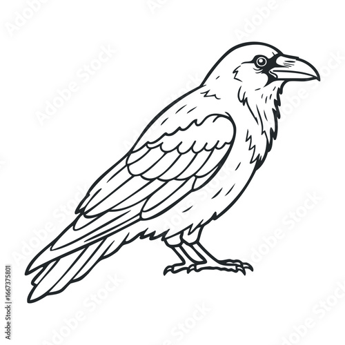 © David, Fototapeta premium Captivating black raven perched on branch forest habitat wildlife illustration natural environment side view bird symbolism. Vector outline illustration