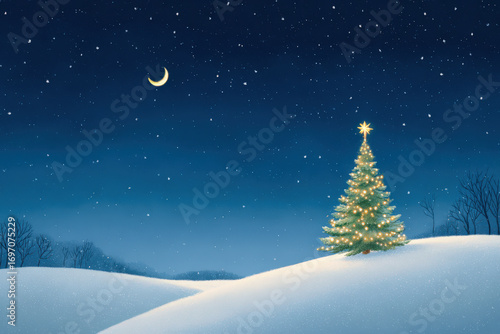 © Levan, Naklejka premium captivating christmas landscape unfolds beneath starry sky featuring lone christmas tree adorned with shimmering