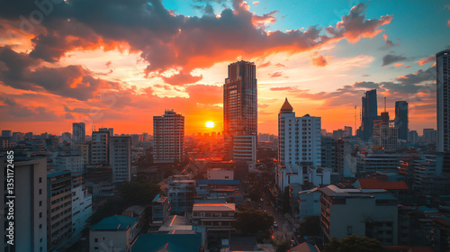 © อรพรรณ วงษ์สถิตย์, Fototapeta premium Captivating city sunset captured with explosive gradient colors creating a serene and picturesque urban scene.