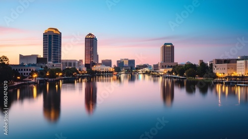 © Kunchan, Naklejka premium Captivating cityscape with towering skyscrapers and their dazzling lights reflected in the calm tranquil waters creating a peaceful and mesmerizing urban scene at nightfall