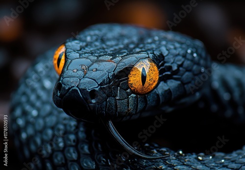 Fototapeta premium Captivating Close-Up of a Black Snake with Striking Orange Eyes, Showcasing...