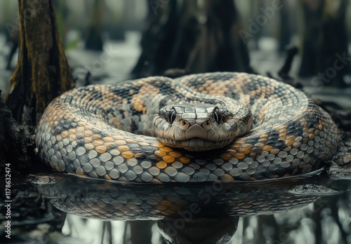 © ANUAR, Fototapeta premium Captivating Close-Up of a Colorful Python Coiled on Wet Ground Surrounded by Unique Forked Roots and Reflections in a Serene Swamp Environment