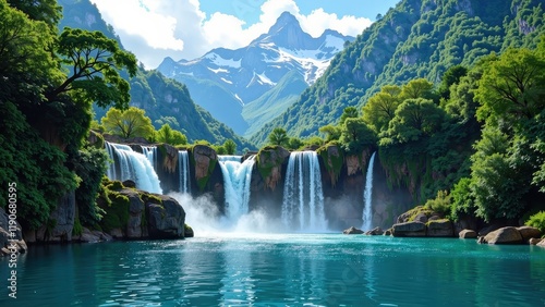 Naklejka premium Captivating close-up of a majestic waterfall cascading into a serene pool,...