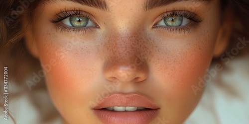Fototapeta premium Captivating close-up of a model with striking green eyes and natural freckles...