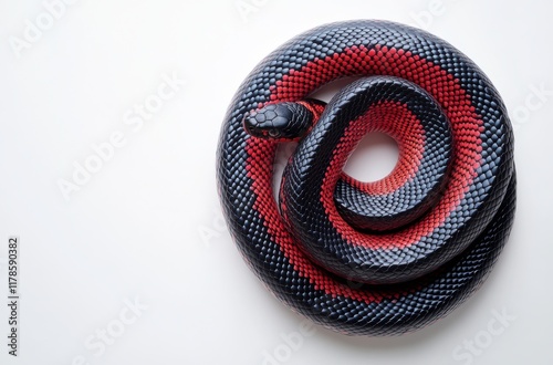 Obraz premium Captivating Close-Up of a Red and Black Coiled Snake on White Background, Showcasing Unique Texture and Color Patterns for Nature and Wildlife Photography