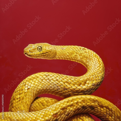 © warunthorn, Fototapeta premium Captivating Close-Up of a Vibrant Yellow Snake on a Red Background