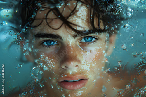 Fototapeta premium Captivating close-up of a young man submerged in water, with vivid blue eyes that pierce through the surface. Water droplets, bubbles surround, tousled hair, freckled skin, clarity, surreal, dreamy