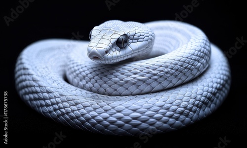 Fototapeta premium Captivating Close-up of an Elegant White Snake Coiled Gracefully Against a Dark Background, Showcasing Unique Scale Patterns and Intriguing Eyes