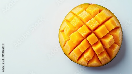© Saranya001, Fototapeta premium Captivating Close Up of Sliced Mango Fruit Displaying Vivid Yellow Tones on Bright Background with Clean Aesthetic